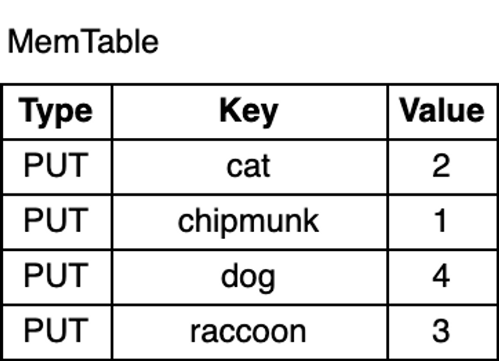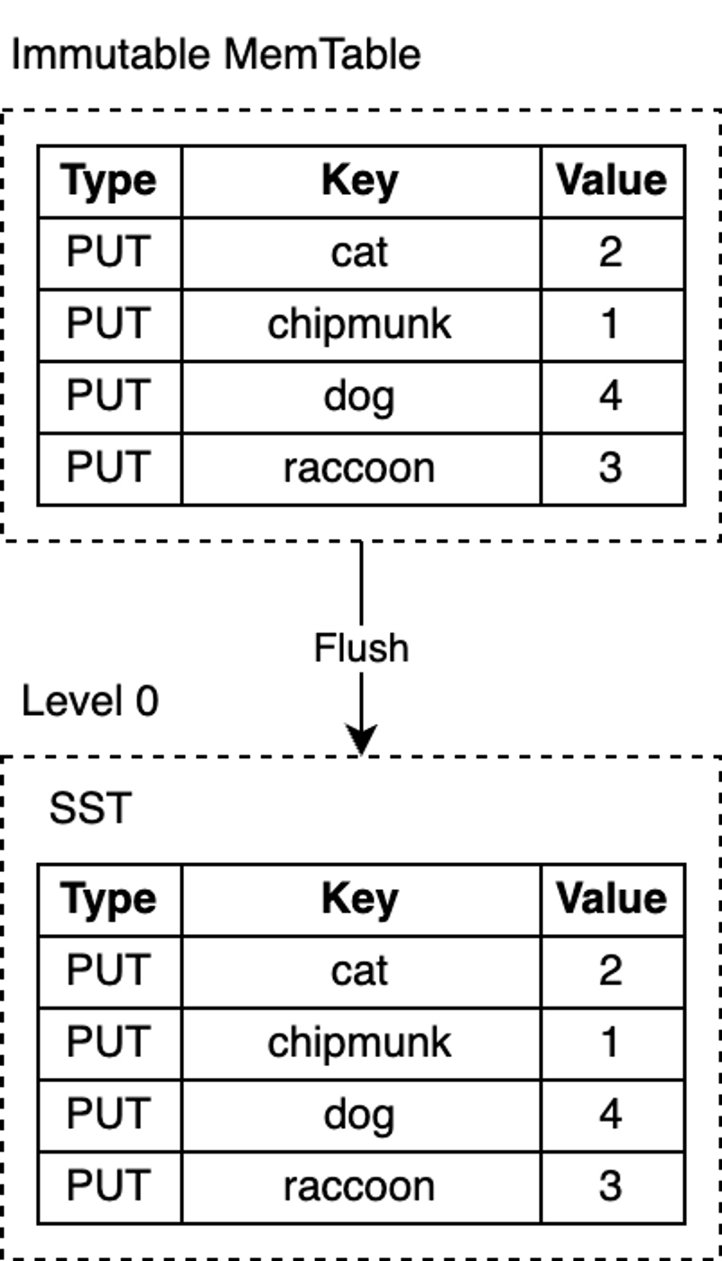 如上图所示,MemTable 中的键值对是按 key 有序排列的。尽管 chipmunk 是最先插入的,但由于 MemTable 是按 key 有序的,因此 chipmunk 排在 cat 之后。这种排序对于范围扫描是必须的。