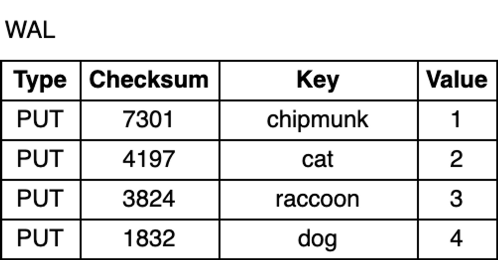 WAL 是一个只允许追加的文件,包含一组更改记录序列。每个记录包含键值对、记录类型(Put / Merge / Delete)和校验和(checksum,可选)。与 MemTable 不同,在 WAL 中,记录不按 key 有序,而是按照请求到来的顺序被追加到 WAL 中。
