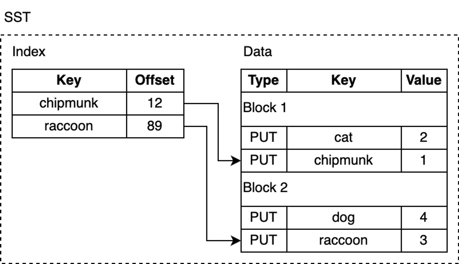 尽管 SST 中的 kv 对是有序的,我们也并非总能进行二分查找,尤其是数据块在压缩过后,会使得查找很低效。RocksDB 使用索引来优化查询,索引存储在紧邻数据块之后。索引块会存储每个 block 中最后一个 key与该key在SST文件中偏移量的映射关系,并且索引块中 key 也是有序的,因此我们可以通过二分搜索快速找到某个 key。
