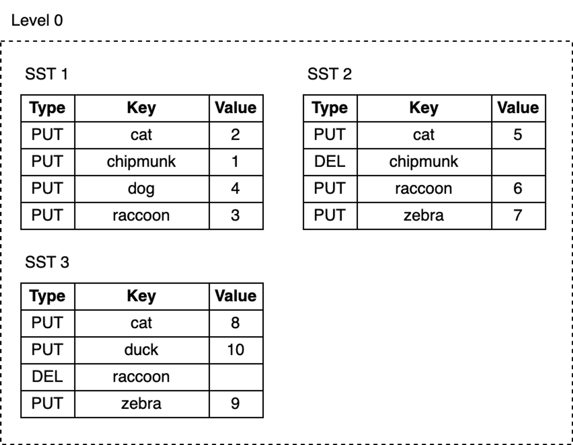 cat这个 key 的三次更新记录分别在 SST1,SST2 和 SST3 中,而chipmunk在 SST1 中有一次更新记录,在 SST2 中有一次删除记录,这些无用的记录仍然占用额外磁盘空间。 - 随着 L0 上 SST 文件数量的增加,读取变得越来越慢。每次查找都要逐个检查所有 SST 文件。