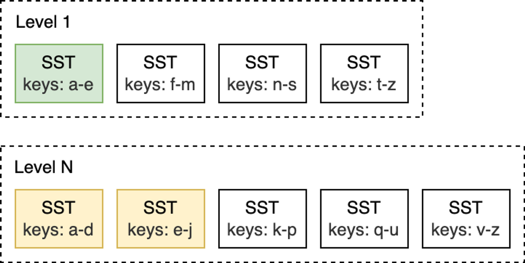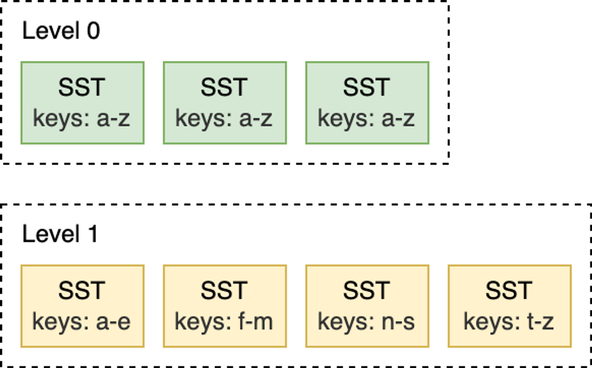 LSM-Tree 的最高层保存在内存中,包含最近写入的数据。其他较低层级的数据存储在磁盘上,层数编号从 0 到 N 。第 0 层 L0 存储从内存移动到磁盘上的数据,第 1 层及以下层级则存储更老的数据。通常某层的下个层级在数据量上会比该层大一个数量级,当某层数据量变得过大时,会合并到下一层。